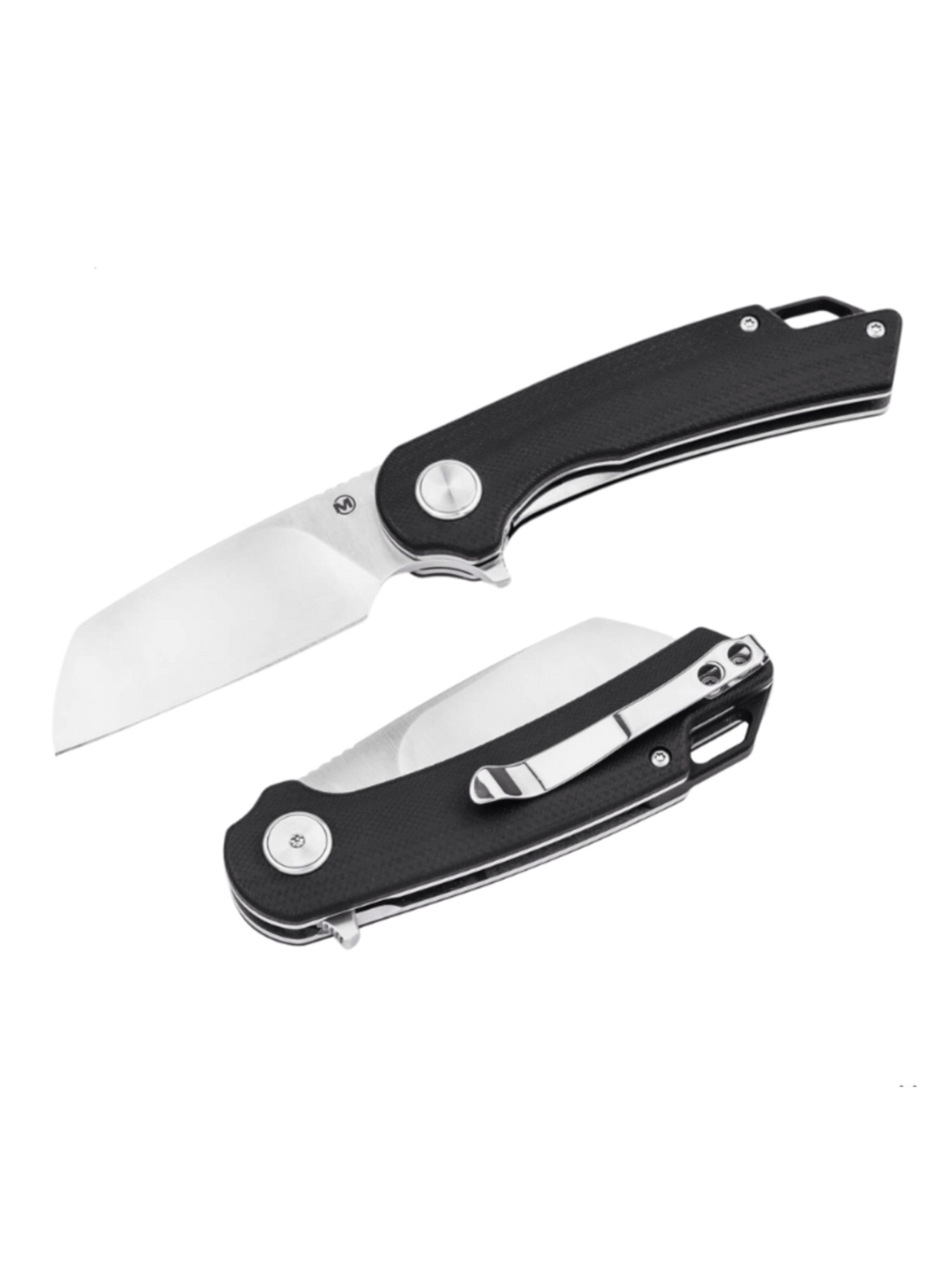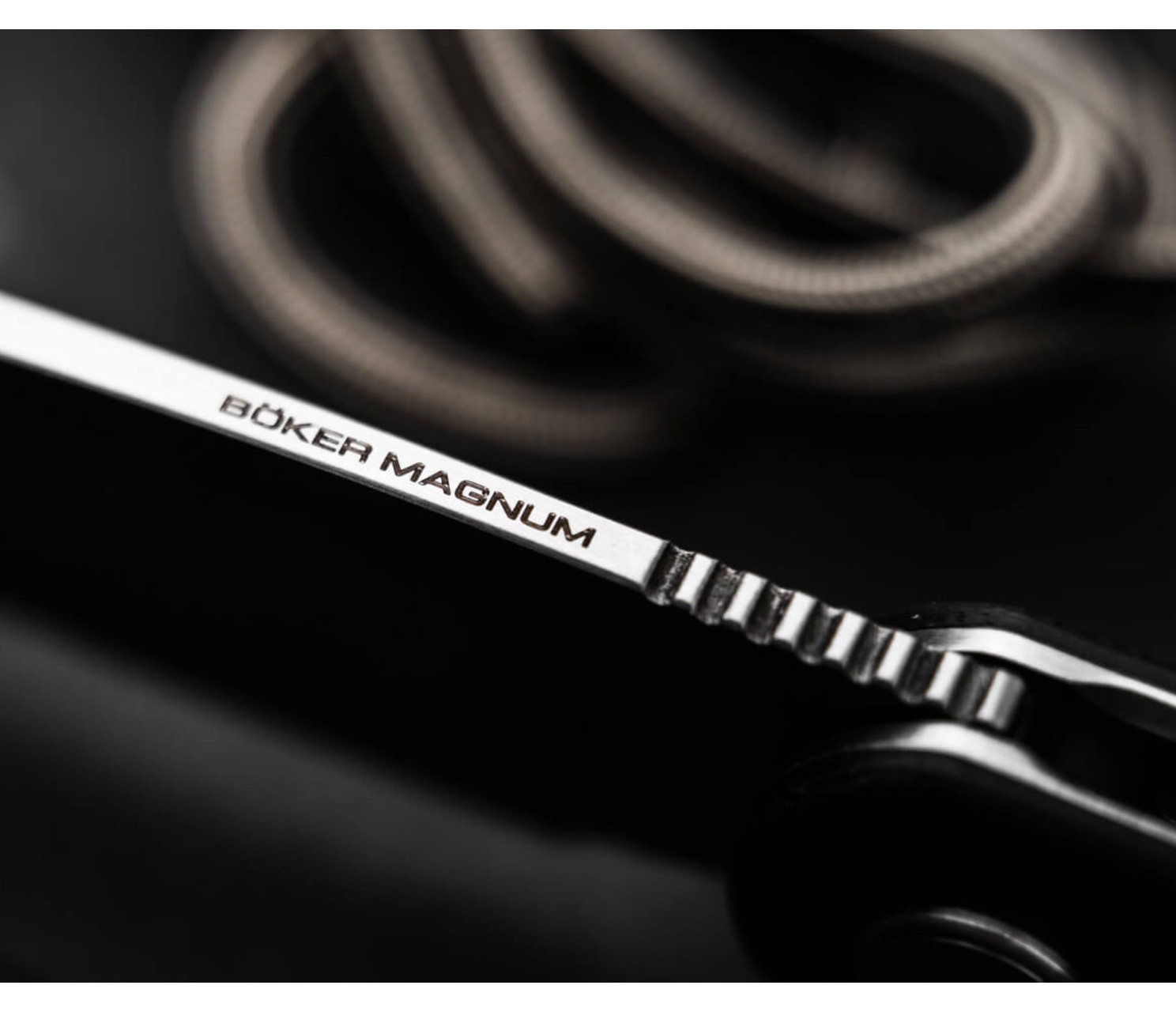 The Magnum Cliff Wharn is equipped with a short compact blade shape to ensure powerful cutting and carving work with a low risk of injury. The satin finished 440B Wharncliffe blade has a ball bearing pivot that opens smoothly with the flipper and locks reliably with the liner lock. The ergonomic handle is made of black G10, has an integrated lanyard hole and non-slip jimping on the back of the blade to ensure maximum control.